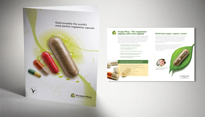 Four page product brochure featuring vegetarian capsules.